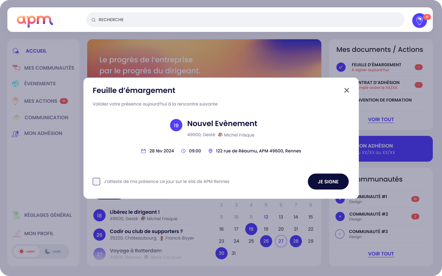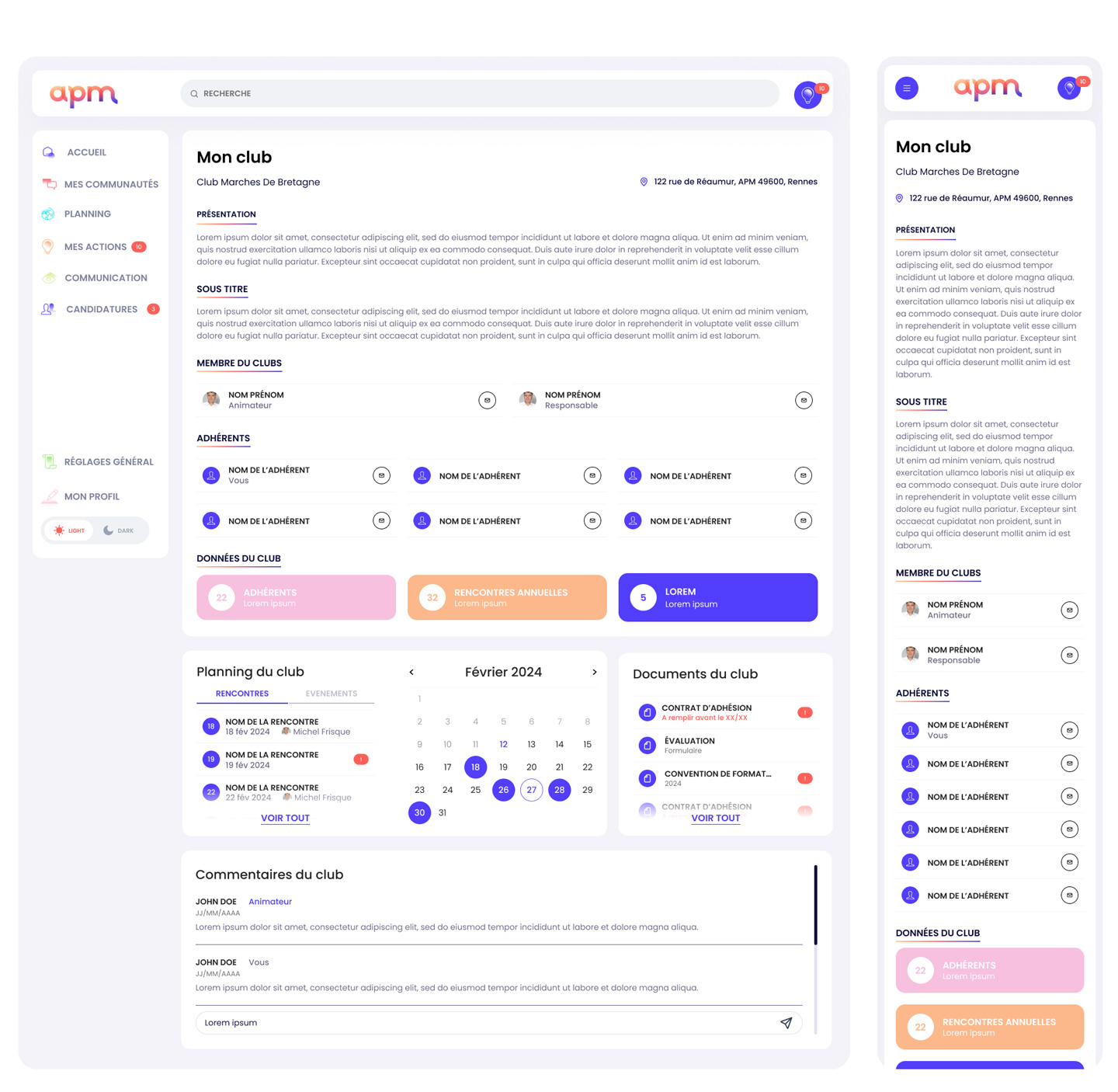 Développement d'une UI pilotée par les composants (modales, indicateurs, statuts) intégrant une logique de permission stricte. L'interface s'adapte dynamiquement au rôle (du Membre au Manager Régional) et communique clairement l'état du système (erreurs, chargements, validations) pour guider l'utilisateur.